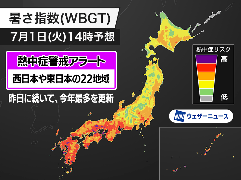 今日7月1日(火)の熱中症警戒アラート 22地域に発表 昨日に続いて今年最多を更新