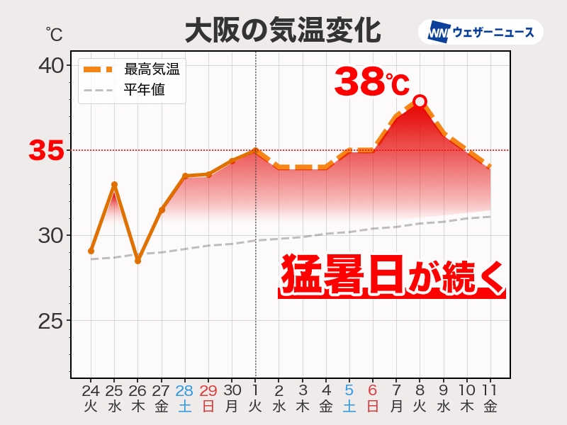各地で昼間は30℃以上の真夏日や、内陸部を中心に35℃以上の猛暑日となるところが続出する見込みで、真夏並みの厳しい暑さが続きます。今後、太平洋高気圧の張り出しは強くなる予想です。