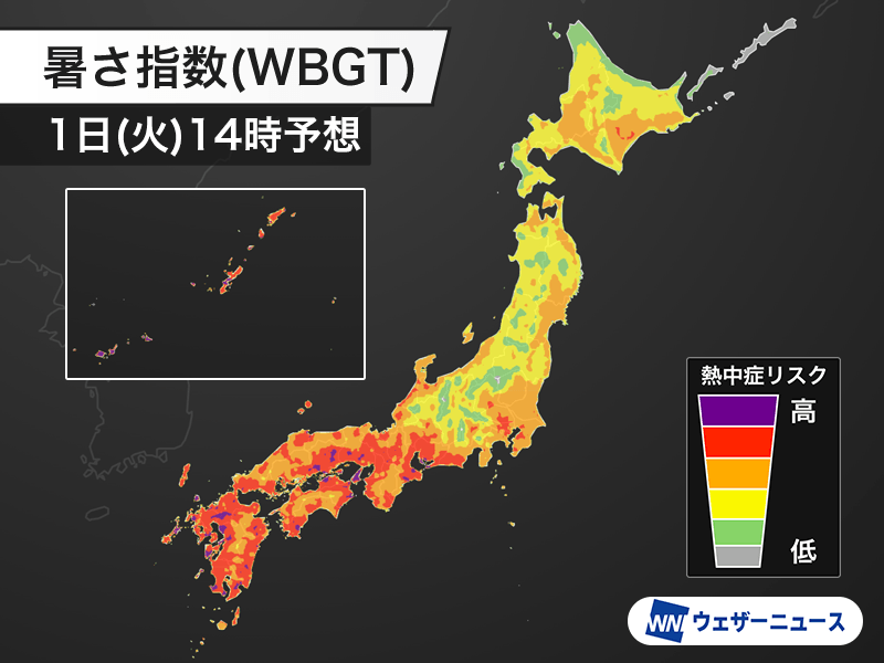 午後の熱中症のリスクの高さの目安となる暑さ指数(WBGT)は、西日本や東海で危険なレベルを示す赤色の領域が広く、一部で非常に危険なレベルの紫色の領域がみられます。午後に雷雨が予想されている関東などはややリスクが低いものの、雨が降って気温が下がらない限りは要警戒です。