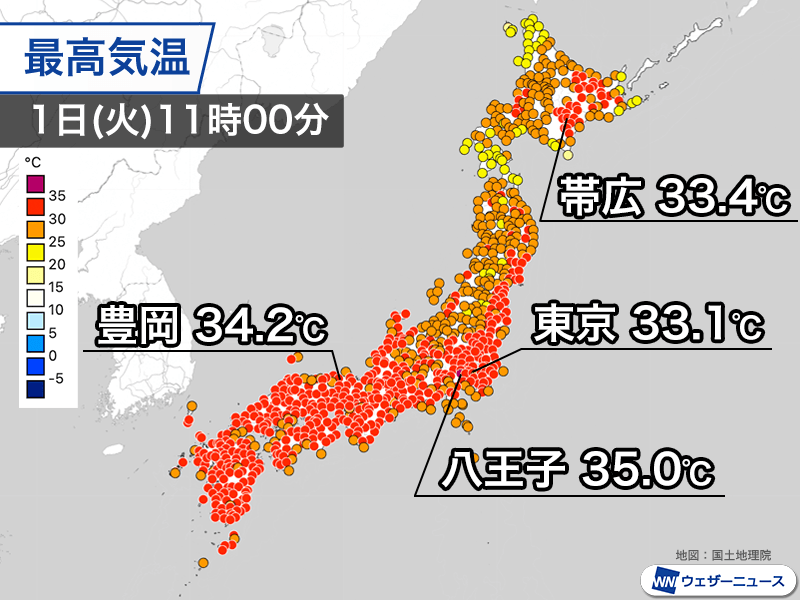 11時00分までの最高気温は東京都八王子市で35.0℃、群馬県中之条町で34.5℃など、関東の内陸部を中心に35℃前後まで上昇。東京都心もすでに33.1℃まで上がってきました。東海以西でも山口県岩国市・広瀬で34.4℃、兵庫県豊岡市で34.2℃など厳しい暑さです。