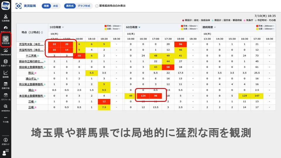 【実況監視】コンテンツで埼玉県や群馬県の雨量実況を見ると、10分間で10mm以上、1時間で100mm以上の雨が観測されていたことがわかります。