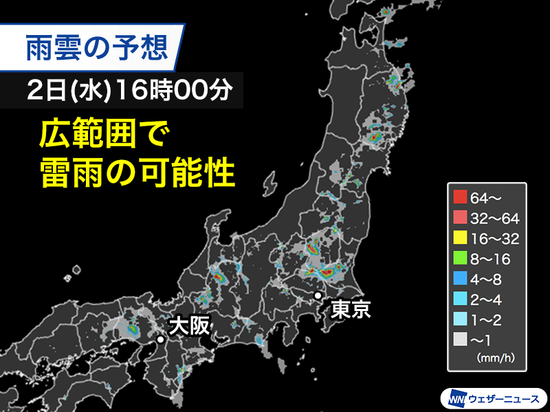 太平洋高気圧は東シナ海に中心を移し、本州付近には湿った空気が流れ込みやすくなっています。さらに上空5500m付近で−6℃以下の寒気を伴った気圧の谷の影響が加わり、気温が上昇する午後は大気の状態が不安定になる見込みです。