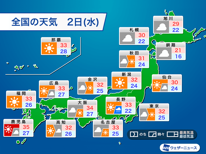 明日3日(木)も西日本を中心に暑さが続きます。最低気温は26〜27℃と熱帯夜の所がほとんどで、最高気温は大阪市で34℃、鹿児島市で35℃まで上がる予想です。