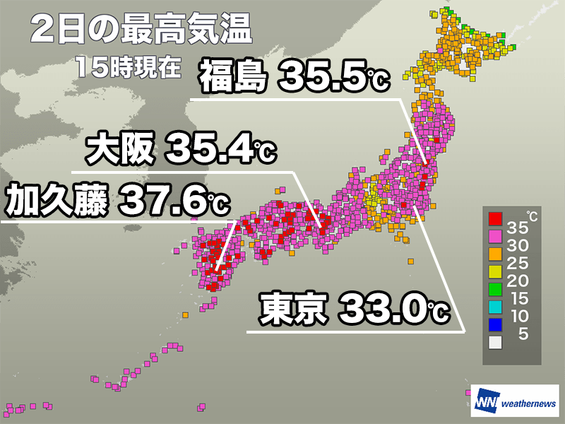 暑さをもたらす太平洋高気圧は中心を西に移しました。高気圧にしっかりと覆われた九州や四国で暑さが厳しく、15時までの最高気温は宮崎県えびの市・加久藤で37.6℃、高知県四万十市・江川崎で37.3℃など体温を上回るような暑さになっています。