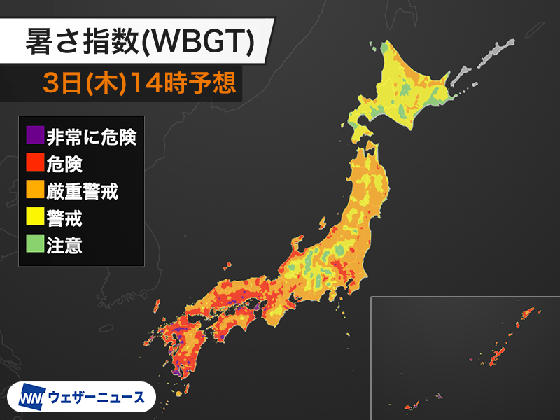 太平洋高気圧に覆われる西日本は夏空が広がり、強い日差しが照りつけます。朝から気温が高く、午後は35℃を超える猛暑日の所がある見込みです。熱中症対策が欠かせません。