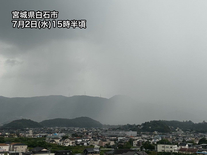 上空を吹く北西の風によって山沿いで発生した雨雲は平野部にも拡大しています。16時00分までの1時間には茨城県高萩市・大能で49.5mmの激しい雨、福島県小野町・小野新町で27.5mm、宮城県大崎市・川渡で22.0mmの強い雨を観測しました。栃木県、福島県、宮城県、山形県、岩手県には大雨警報や洪水警報、福島県には土砂災害警戒情報が発表中です。