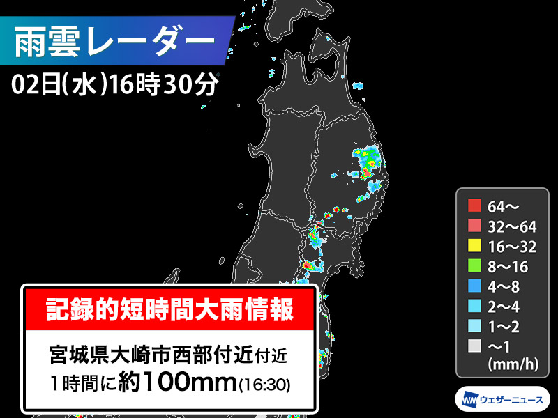 宮城県で1時間に約100mmの猛烈な雨 記録的短時間大雨情報
