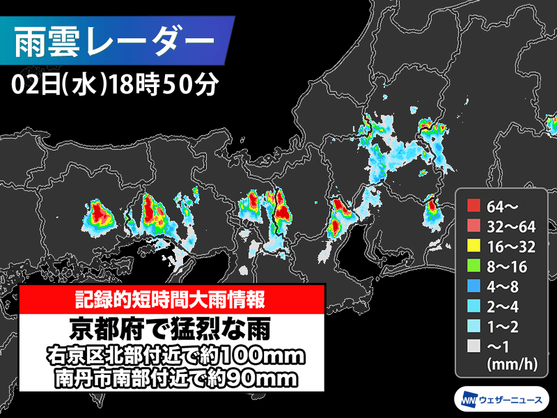 京都府で1時間に約100mmの猛烈な雨 記録的短時間大雨情報