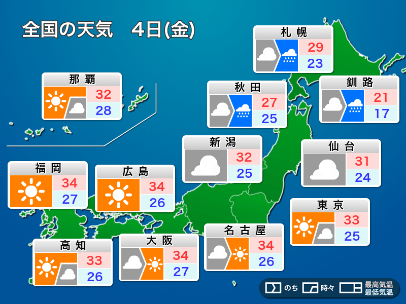 西日本や東日本は雲が広がるエリアがあっても、強い日差しが照り付けてうだるような厳しい暑さが続きます。