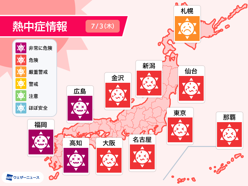 全国で最も高い最高気温は富山県秋ヶ島の35.3℃となっています。東京(32.1℃)は8日連続、名古屋(33.6℃)は9日連続、大阪(32.5℃)と福岡(32.4℃)は7日連続の真夏日です。
