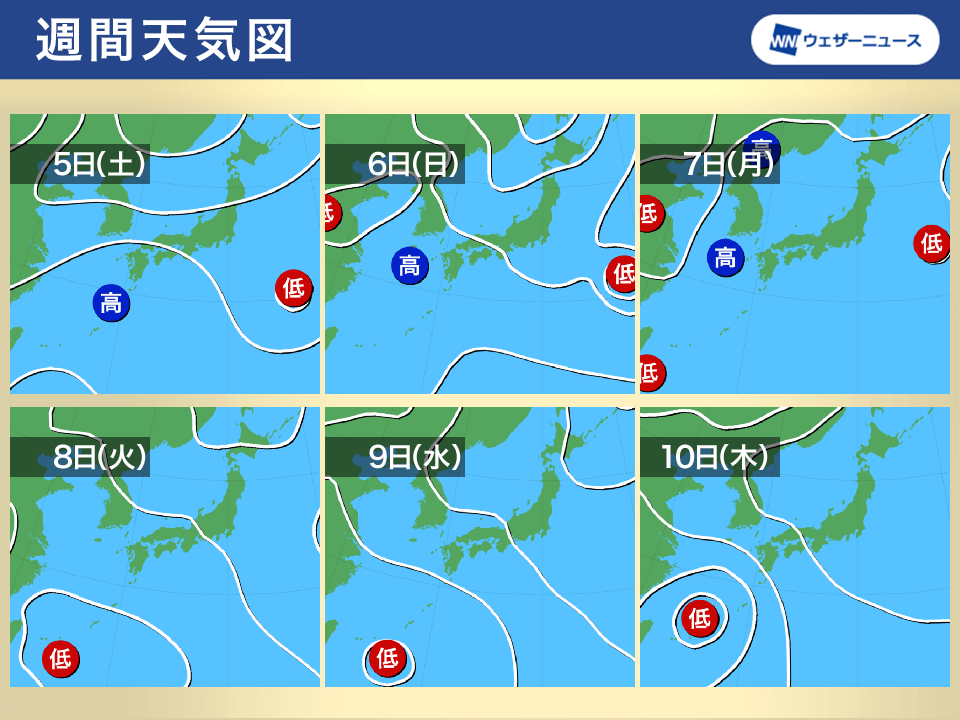 週末から週明けにかけて太平洋高気圧の中心は東シナ海に位置し、その後は勢力を強めながら山陰沖に進み、本州付近を広く覆う予想です。