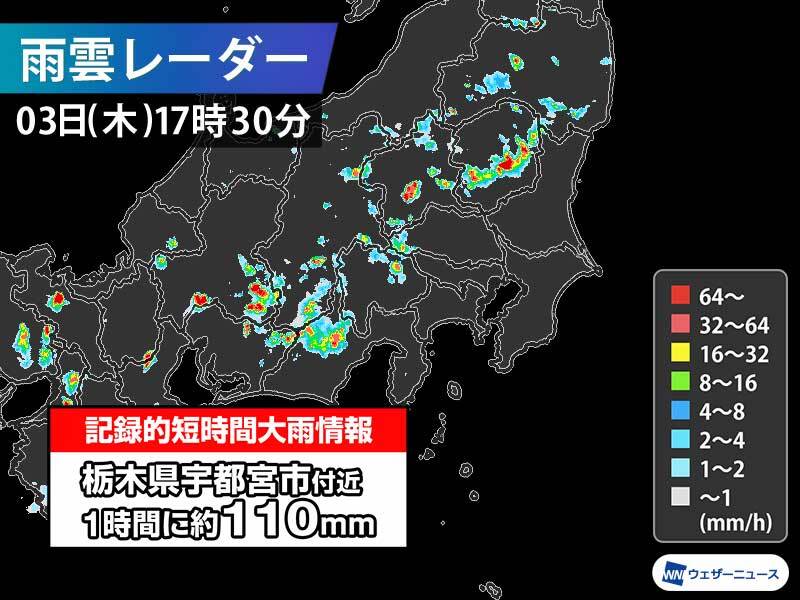 栃木県で1時間に約110mmの猛烈な雨 記録的短時間大雨情報