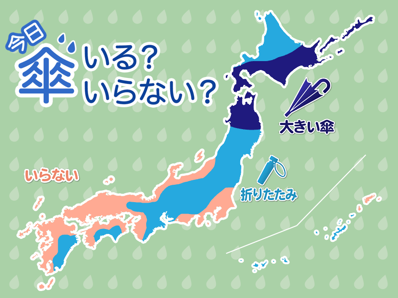 北海道の道央や道北、東北南部は雲が多く、雨の可能性があります。また、東日本内陸部や西日本太平洋側でも急な雨が心配です。これらのエリアでは折りたたみ傘があると安心です。