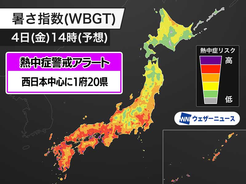 今日7月4日(金)の熱中症警戒アラート 京都府など1府20県に発表