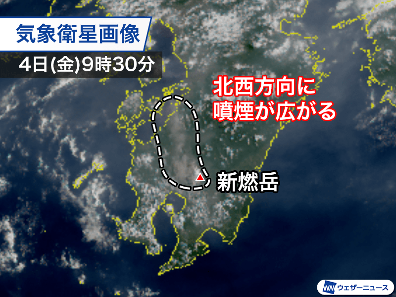 噴煙は上空2000m前後の風によって西〜北西方向に広がっていて、気象衛星ひまわり9号の画像では熊本県南部まで広がっていることが確認できます。