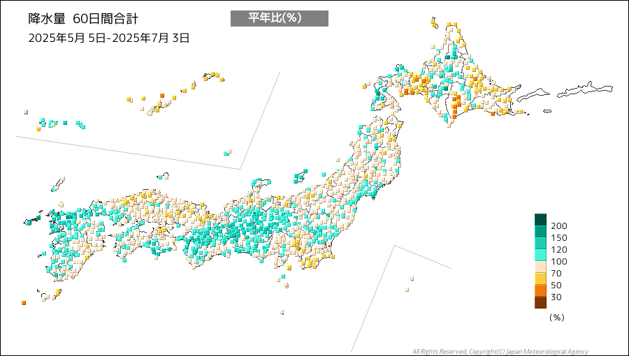 夏らしい天気が続くと気になるのは水不足です。幸い、今年はこれまでに降った雨の量が平年の同時期と比べると多めの所が多くなっています。