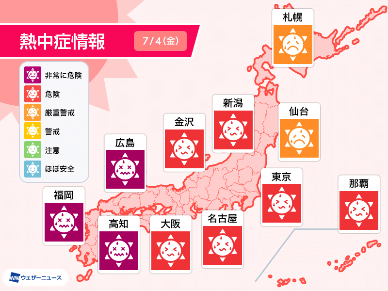 熱中症のリスクは高く、九州や中国、四国では「非常に危険」なレベルの地域もあり、近畿から東日本の各地も「危険」レベルの予想です。