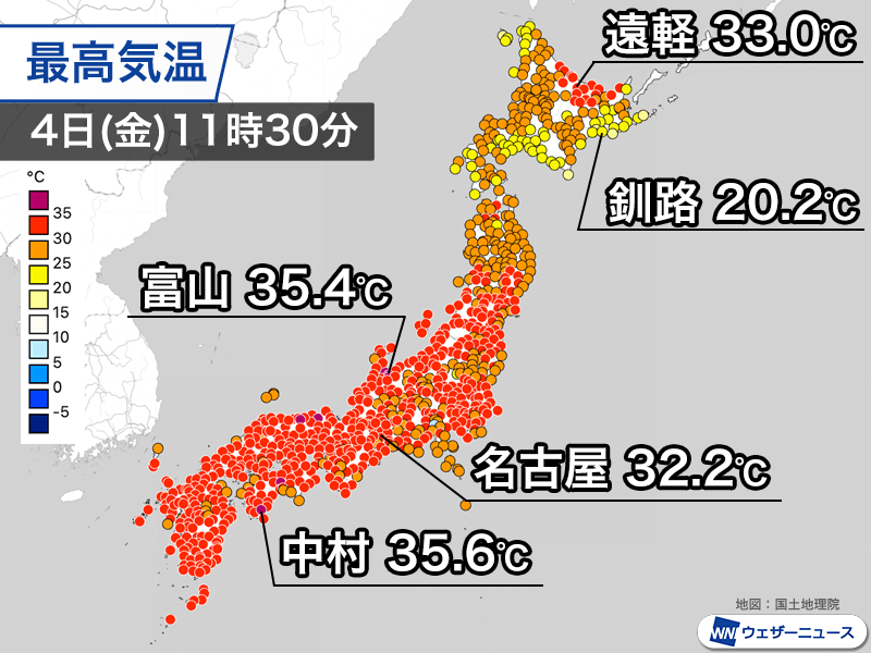 11時30分までの最高気温が全国で最も高いのは高知県四万十市・中村と本山町で35.6℃を観測。富山市と兵庫県豊岡市で35.4℃、鳥取市は35.3℃とすでに35℃以上の猛暑日です。梅雨明けが発表された東海はやや雲が多いこともあって西日本に比べると気温の上がり方は鈍く、名古屋市は32.2℃となっています。