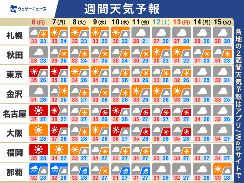 太平洋高気圧の勢力が強まるため、東日本から西日本にかけて夏本番の天気がしばらく続く予想です。晴れて気温が上がり、各地で35℃以上の猛暑日となるところも多くなる見込みで、真夏並みの厳しい暑さになります。