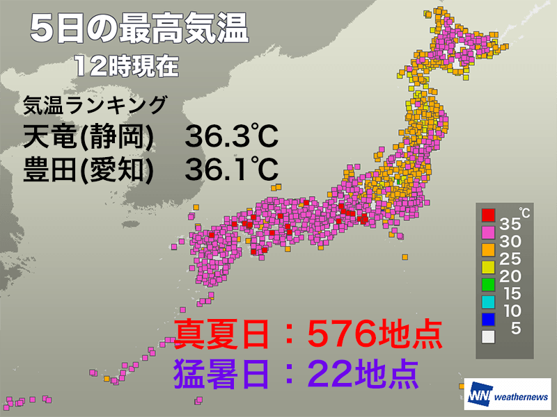 猛暑日地点は22地点で最も高い最高気温は静岡県天竜の36.3℃。東京の最高気温は32.2℃を観測して10日連続の真夏日となっています。