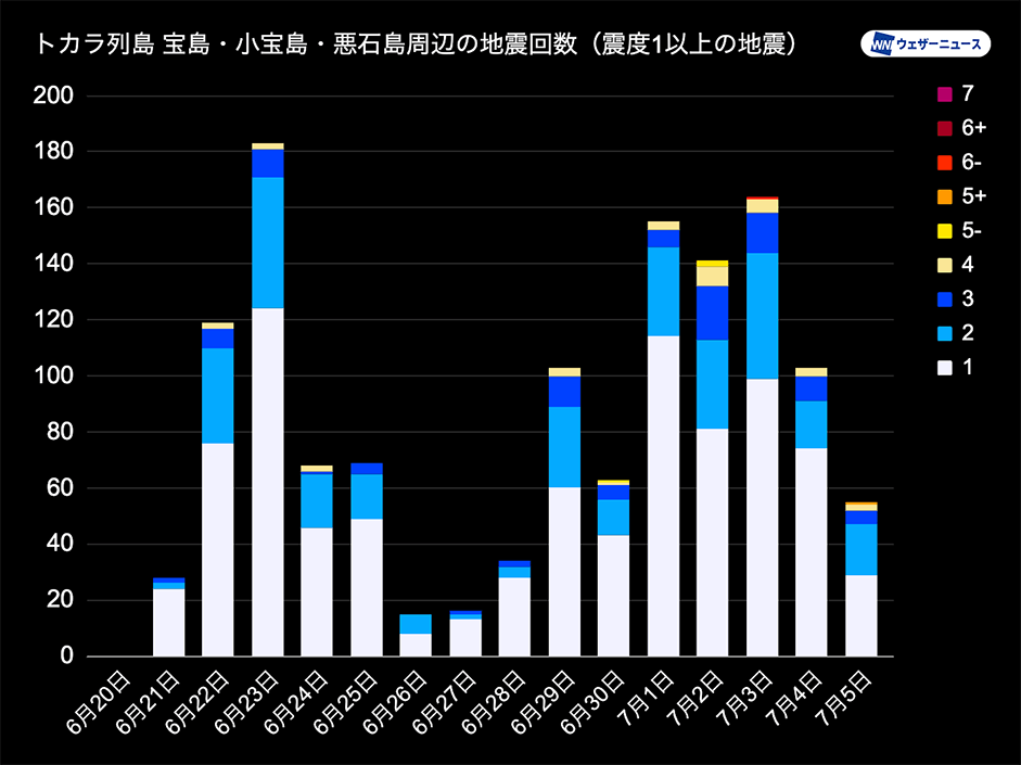6月21日から始まったトカラ列島近海の群発地震は、1週間の経過で活動が低下し始めていましたが、29日(日)から再び活発になっています。地震の規模M5.4は今回の群発地震の中では3番目タイの規模、震度5強は2番目の揺れの大きさでした。震度5弱以上を観測するのは今回の群発地震の中では5回目です。