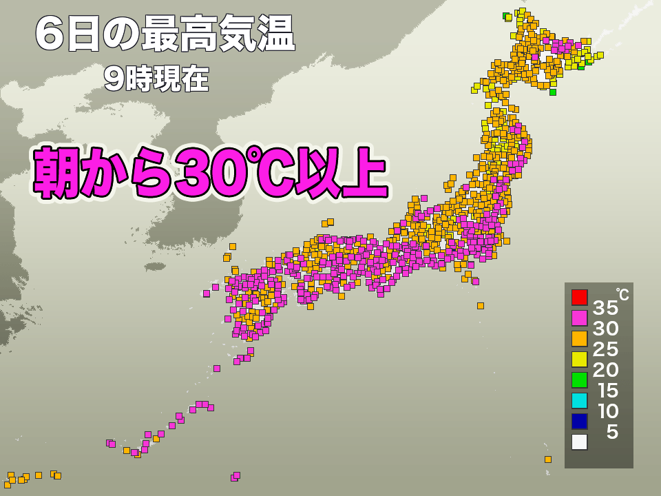 昨夜はあまり気温が下がらず、エアコンなしでは寝苦しい夜となった所が多そうです。このため朝から既に気温が高く、すでに30℃を超えている地点が多くなっています。