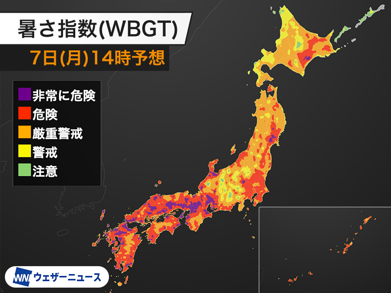 明日7日(月)は夏の高気圧が本州を覆うため、広い範囲で晴れて気温が上がります。東海や西日本では、局地的に体温を大きく上回るような危険な暑さとなるところもある予想です。