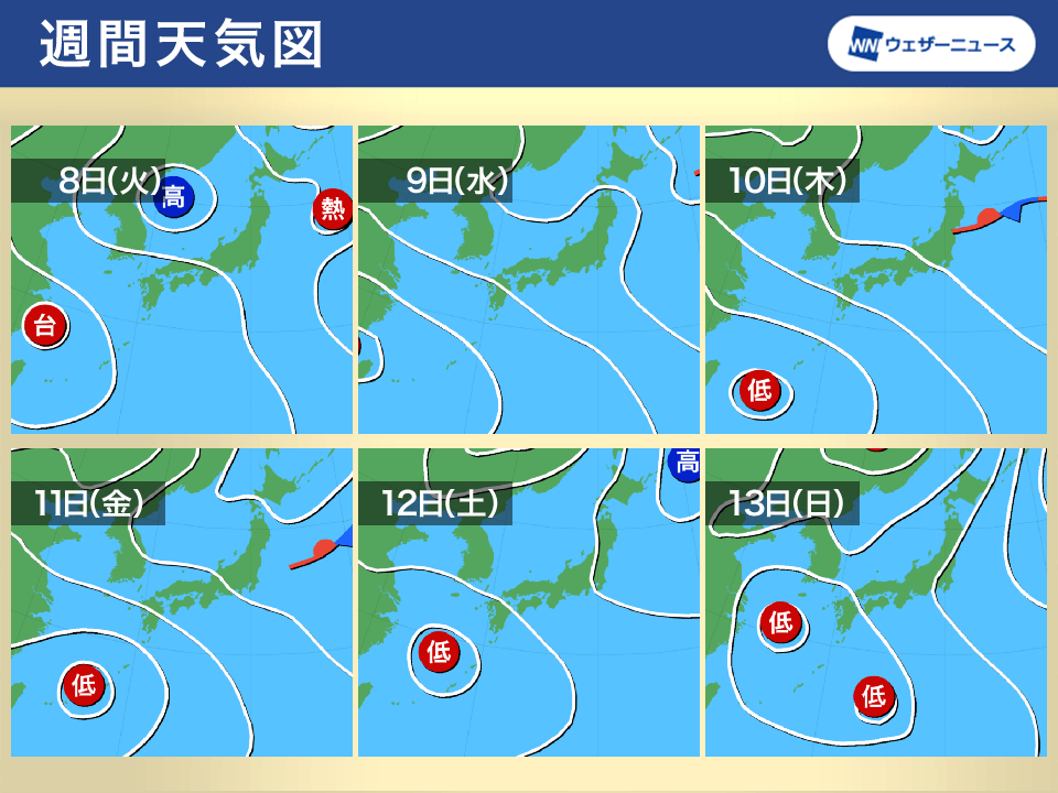 明日7日(月)以降、日本海周辺の背の高い高気圧が本州付近を広く覆い、地上で高温となりやすい気圧配置が続きます。