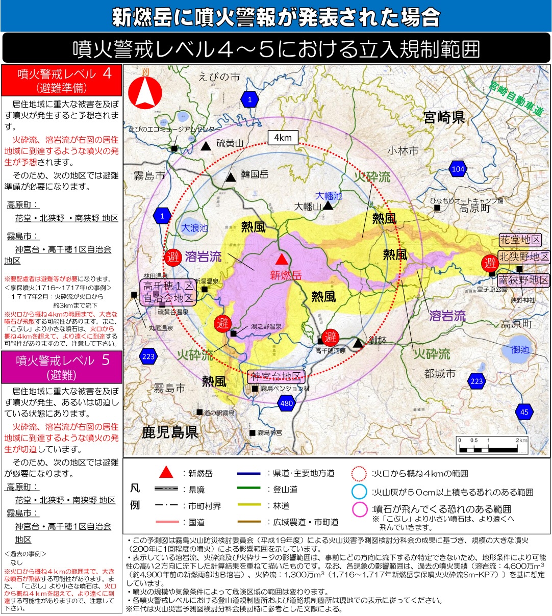霧島山(新燃岳)の防災マップの、マゼンタとオレンジで塗られた範囲では、火砕流の危険性があるとされています。噴火が山体のどこで起こるかや、火孔の形状次第で範囲が代わることも想定されますが、一つの目安としてご確認ください。