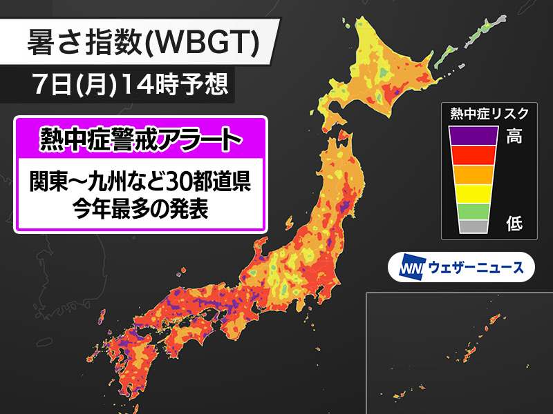 今日7月7日(月)の熱中症警戒アラート 北海道など今年初 最多の30都道県に