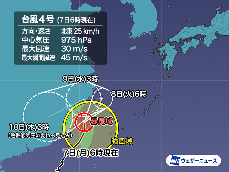 台風4号は昨夜21時に強い勢力に発達しましたが、今日7日(月)6時現在はやや衰弱して、強い勢力ではなくなりました。ただ、先島諸島は風速15m/s以上の強風域に入っています。