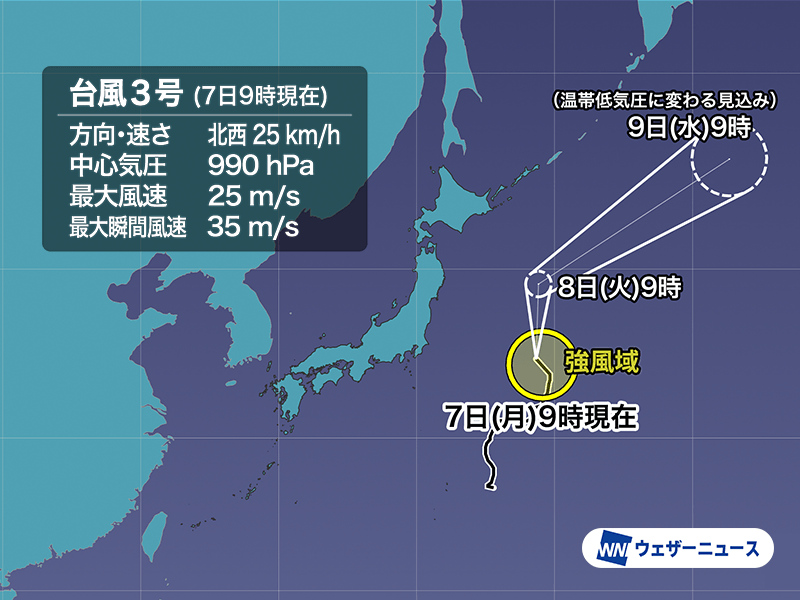 台風4号は昨夜21時に強い勢力に発達しましたが、今日7日(月)9時現在はやや衰弱して、暴風域もなくなりました。ただ、先島諸島は風速15m/s以上の強風域に入っているところがあります。