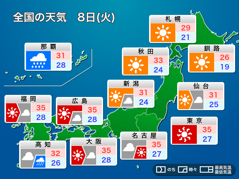 今日7日(月)15時までの最高気温は、名古屋で37.8℃、大阪37.4℃、広島35.0℃となっています。東京都心では35.6℃と、今年初の猛暑日となりました。