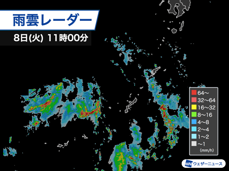 台風本体付近に加えて、台風から離れた南東側にも発達した雨雲が見られます。これは台風に向かって流れ込む暖かく湿った空気の影響で発生しているもので、奄美大島にあるアメダスの古仁屋では10時10分までの1時間に11.0mmのやや強い雨を観測しました。雷も頻発しています。