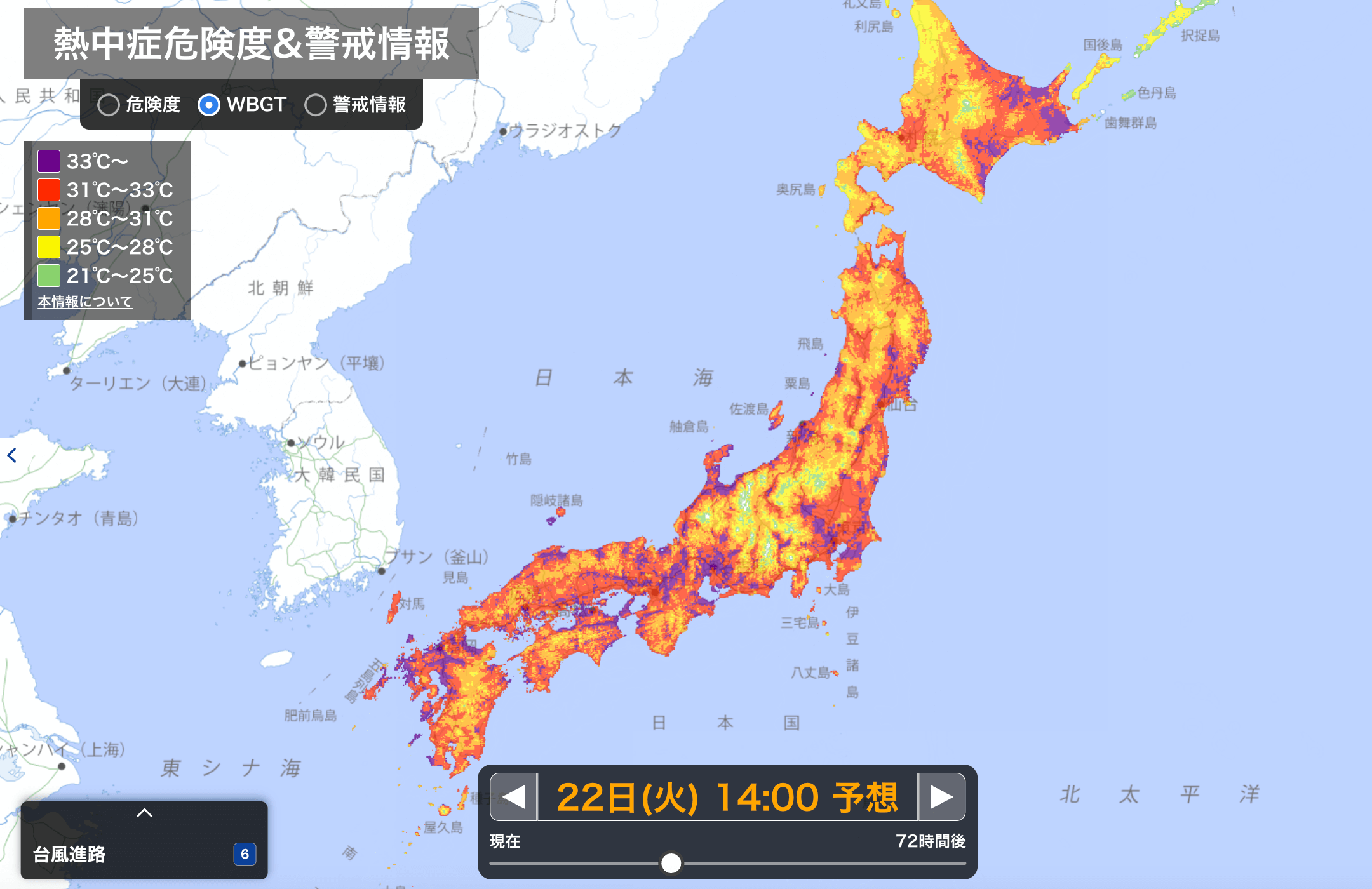 ウェザーニュース for businessでは熱中症の危険度を地図上で把握することができます。7月22日は暑さ指数であるWBGTが高くなると予想されるエリアが北海道にまで及びました。実際の最高気温は「大暑」の名の通り、全国的に暑さが厳しく、関東や近畿、東北の内陸部で38℃以上の猛烈な暑さになりました。