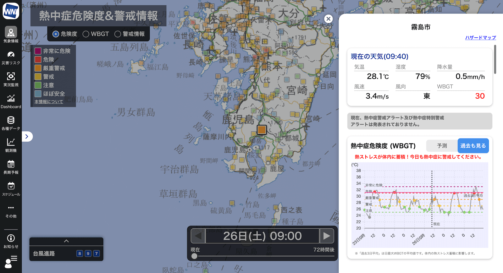 熱中症危険度&警戒情報は、今年6月からバージョンアップしています。従来、翌々日までのWBGT・熱中症危険度予測を表示していましたが、それに加えて、過去3日間のWBGTの実績値も確認できるようになりました。また、2024年に実施したソラテナProの観測値と熱中症罹患者データの分析をもとに、特に注意が必要な日を判定、注意喚起メッセージを表示しています。さらに、7月25日(金)からは、「熱中症の特注日アラーム」として通知サービスの提供を開始しました。
