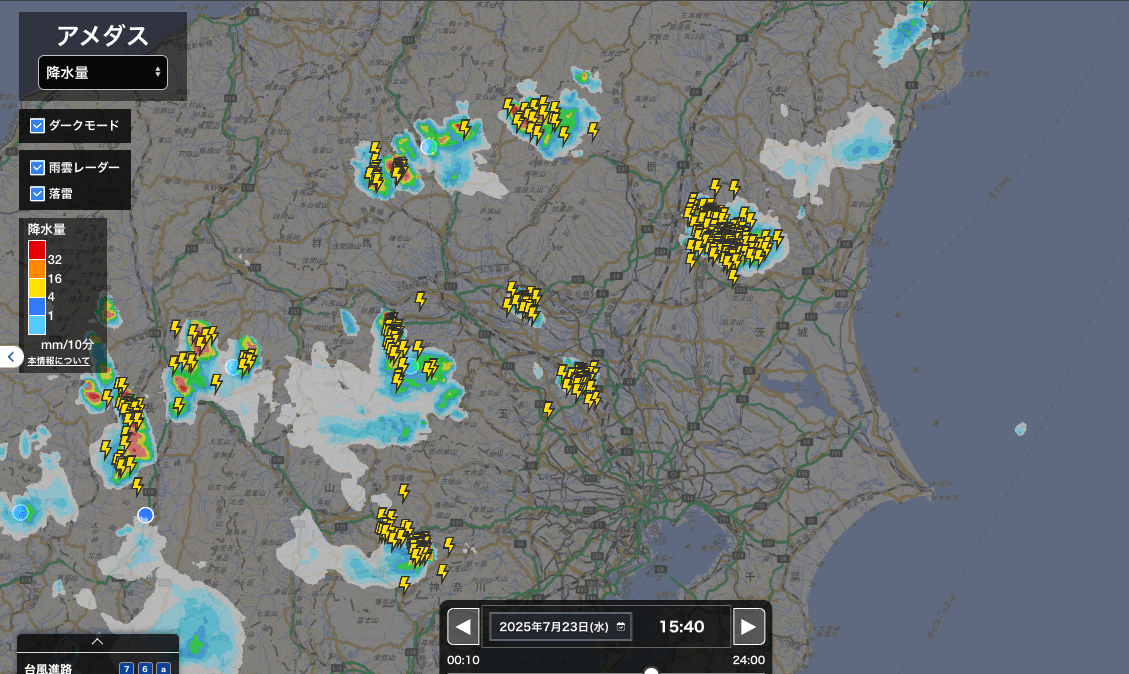 画像は7月23日の関東周辺のレーダーや雷の様子を示していますが、この日は栃木、群馬で1時間に約110mmの猛烈な雨となりました。