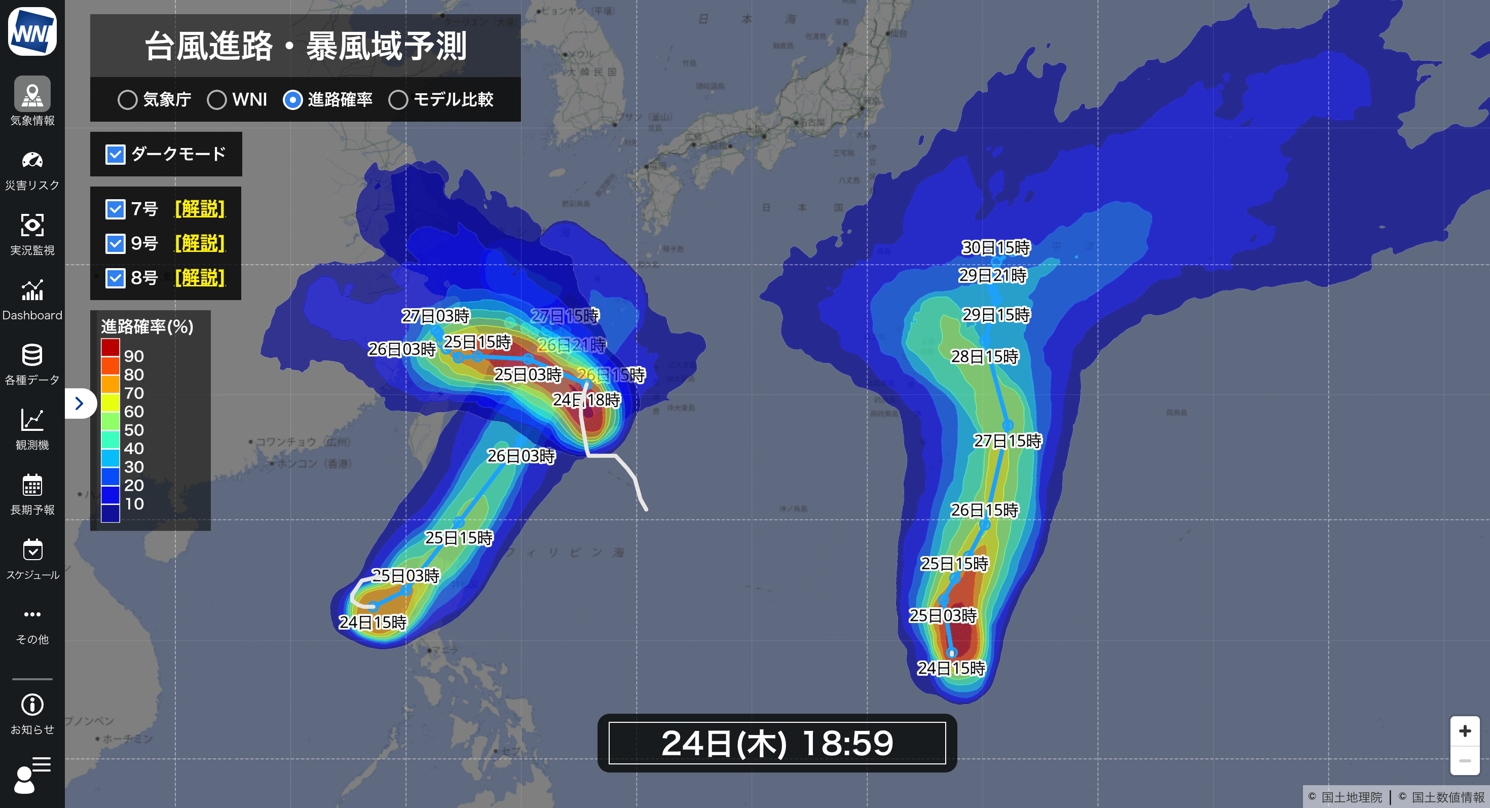 7月23日に台風7号、台風8号、7月24日に台風9号が相次いで発生しました。ウェザーニュース for businessの台風進路・暴風域予測で「進路確率」を選択すると、台風の中心位置が今後進む確率の高いエリアから10%刻みで描画したマップを確認することができます。
