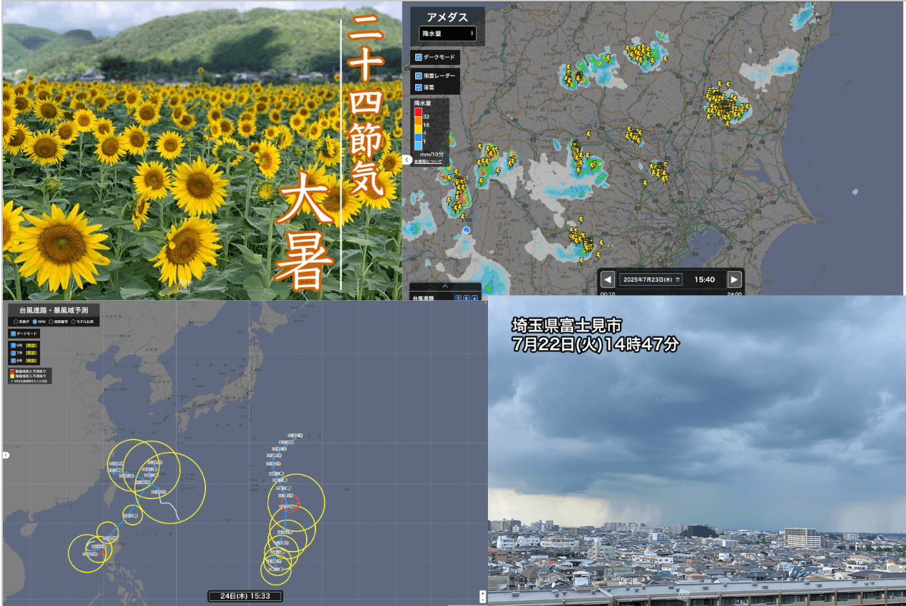 厳しい暑さの日は熱中症だけでなく、急な天候の変化、ゲリラ雷雨に注意が必要です。連日、午後は山沿いを中心に雷を伴った激しい雨となったところがありました。