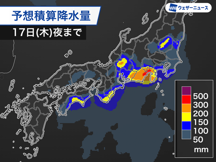 また、東海では週後半にかけての雨量がかさみ、多い所では300mmを超える大雨となるおそれがあります。地盤が緩むことで平常時よりも少ない雨量で土砂災害が発生するおそれがあるため、傾斜地など危険な場所には近寄らないようにしてください。