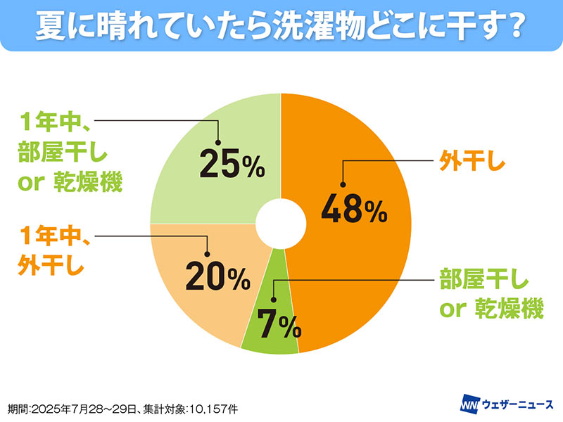 ウェザーニュースで「夏に晴れていたら洗濯物どこに干す?」というアンケート調査を実施したところ、「外干し」が48%で最も多い割合を占めました。「1年中、外干し」を含めると、約7割の方が夏は外干しをしているようですが、外干しには注意も必要です。