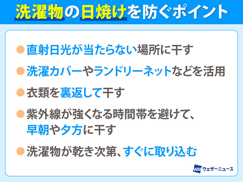 時間帯は紫外線が最も強いとされる10~14時を避け、早朝や夕方に干すようにしてください。なるべく紫外線に当たる時間を短くするため、洗濯物が乾き次第、すぐに取り込むよう心がけましょう」(鈴木代表)