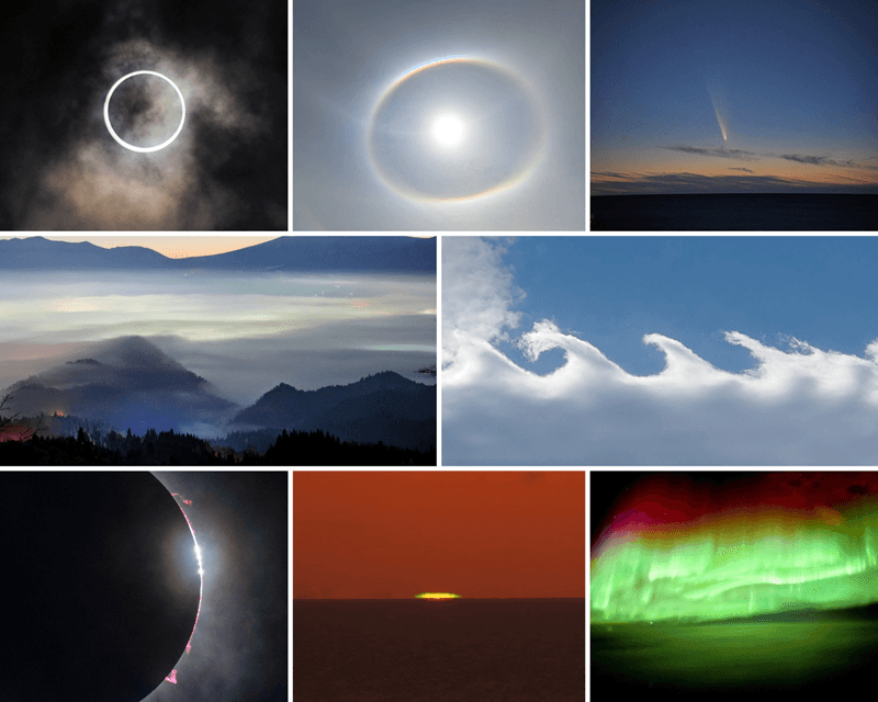・「グリーンフラッシュ」:日の出直後や日の入り直前の太陽の光が緑色に輝いて見える現象