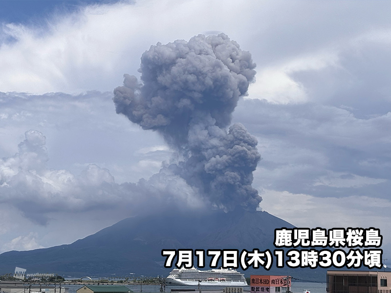 今朝の桜島の噴火は南岳山頂火口で発生し、噴煙量はやや多量と報じられています。噴煙は上空の風に乗って、北西方向(鹿児島市吉野方向)に流れています。気象庁によると、風下の地域では降灰による影響に注意してください。17日(木)19時までに鹿児島市(桜島)ではやや多量の降灰があり、降灰は熊本県天草市まで予想されています。