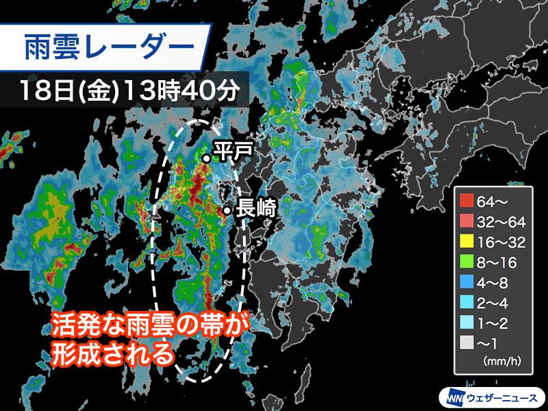 雨雲のかかり始めた長崎県長崎市や平戸市などで雨が強まっていて、夕方にかけて活発な雨雲が次々に通過する見込みです。13時45分の時点では長崎県、宮崎県、鹿児島県の一部に大雨警報や洪水警報が出ています。