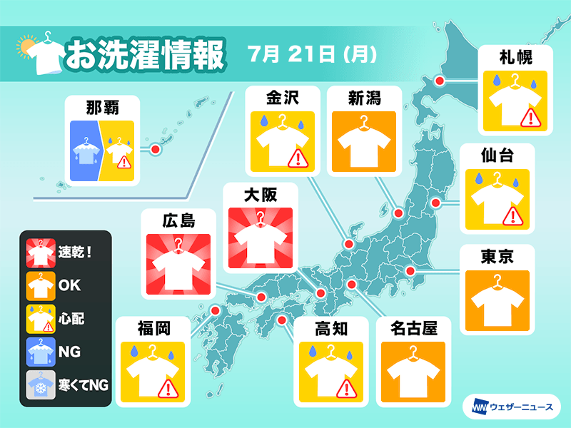 東北北部や北海道は日本海から雨雲が接近するので雨が降る予想です。部屋干しが良さそうです。