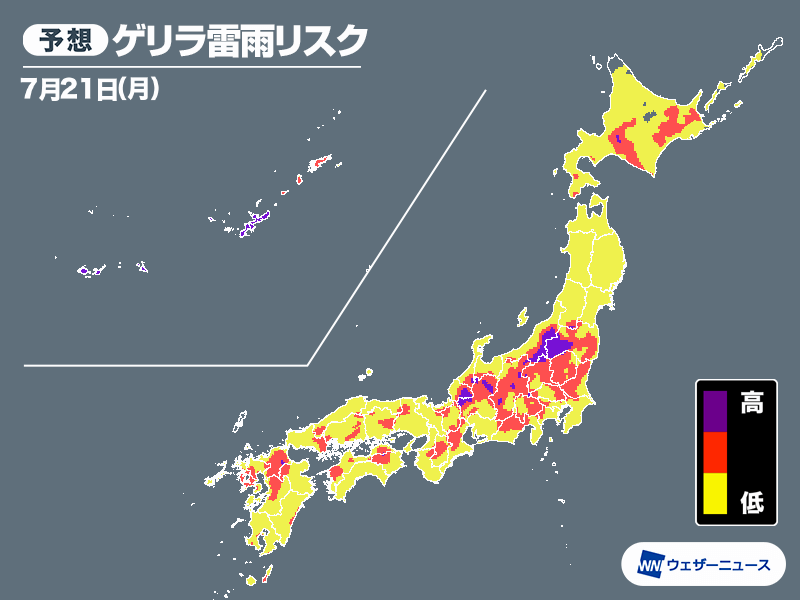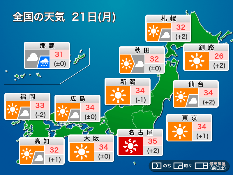 今日21日(月)海の日も夏の高気圧の影響により広い範囲で晴れる予想です。昼間は気温が30℃を大きく上回り、猛暑となるエリアもあります。最大限の熱中症対策が欠かせません。