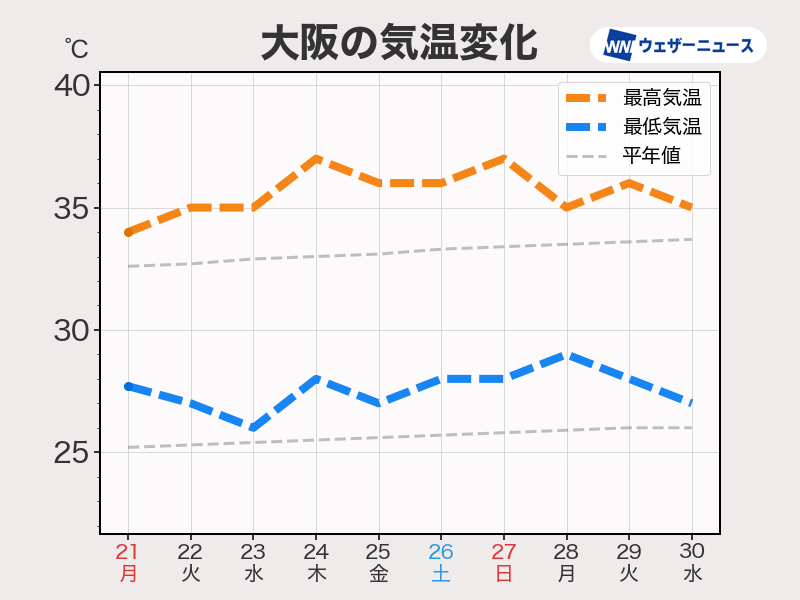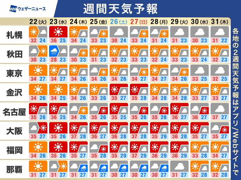 各地とも本格的な暑さが続きます。内陸部を中心に最高気温が35℃以上の猛暑日が続出し、西日本や東日本は夜も最低気温が25℃未満にならない熱帯夜が続く予想です。