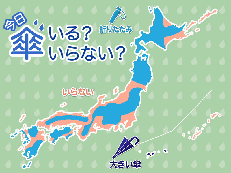 東北から近畿、中国、九州北部の山沿いや内陸部では急な雨の可能性があります。強雨や雷雨のおそれもあるため、晴雨兼用の傘があると良さそうです。