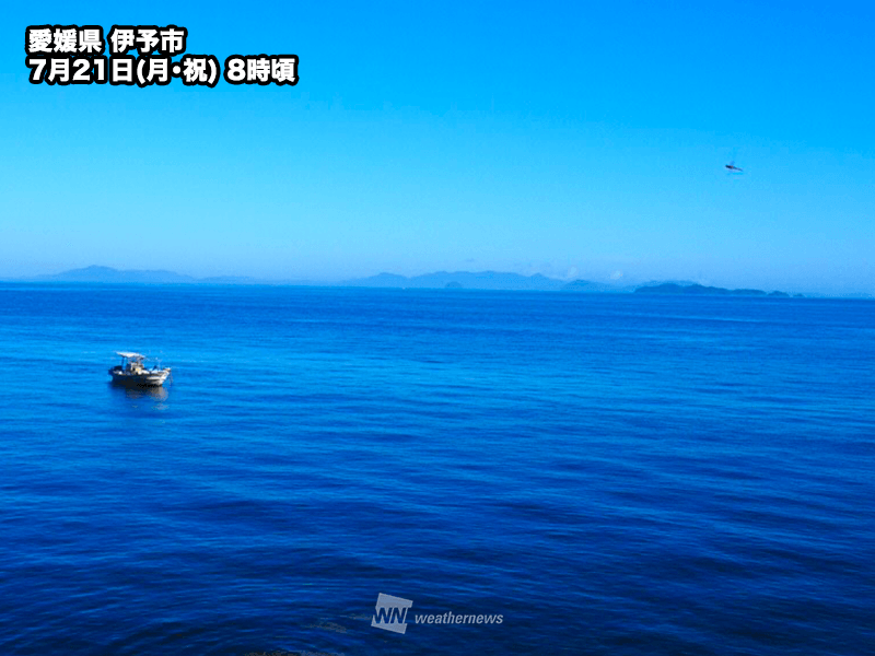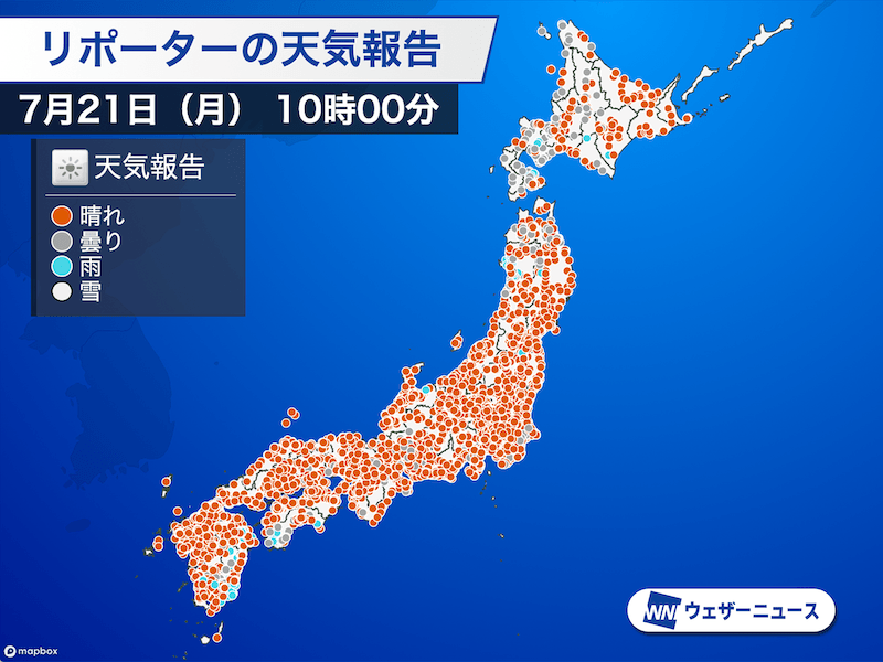 今日7月21日(月・祝)は東北から九州にかけて、海の日にふさわしい夏空が広がっています。午後にかけても晴天が続き、最高気温は35℃くらいまで上がるところもある予想です。